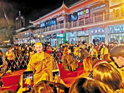 當(dāng)晚7時許,途經(jīng)表演現(xiàn)場的人流從四面八方聚攏于此,人們頻頻舉起手機(jī)將鏡頭對向眼前裙袂飛揚(yáng)、舞姿優(yōu)美的“大地灣女神”和頷首微笑、靜若處子的“東方微笑”,一時間,閃光燈忽明忽暗此起彼伏,行人你來我往人聲鼎沸,步行街頃刻間歡聲笑語、熱鬧非凡。記者發(fā)現(xiàn),扮作“不倒翁”的“女神”模仿大地灣出土的人頭瓶外部特征,而一旁采用懸浮藝術(shù)呈現(xiàn)的“小沙彌”,打禪靜坐、頷首微笑。