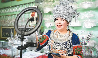 在古州鎮(zhèn)老街,銀飾店店主在進行網絡直播銷售銀飾。