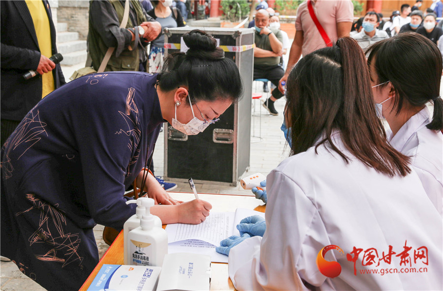 觀看演出人員在隍廟門口掃描“健康碼”,經(jīng)工作人員驗(yàn)證、測(cè)溫、登記后予以放行入場(chǎng)。演出場(chǎng)地人數(shù)達(dá)到150人之后,不再放行。所有觀看演出人員在工作人員引導(dǎo)下佩戴口罩、間隔就坐,保持1米以上距離。演出人員在臺(tái)上臺(tái)下也保持一定距離。