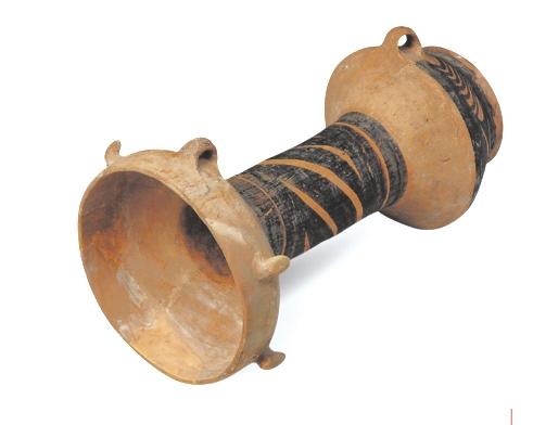 弦紋彩陶鼓 馬家窯文化馬家窯類型(距今約4800年),永登縣出土。這是一只陶鼓,鼓的兩端各有一耳,用于系繩,一端為喇叭口,另一端為罐形口,喇叭口外有六個爪突,用于固定鼓面。想必是用緊繃的獸皮做鼓面,這應(yīng)是腰鼓的雛形,是迄今為止發(fā)現(xiàn)時代最早的打擊樂器。
