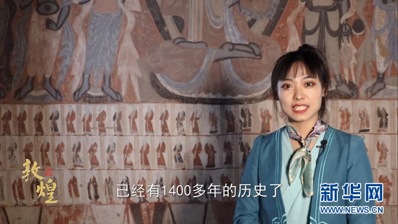 “‘敦煌仿妝’好了,我們一起去看看壁畫原作吧!”鏡頭一轉(zhuǎn),班銳從美妝博主成了穿著工作服的講解員。