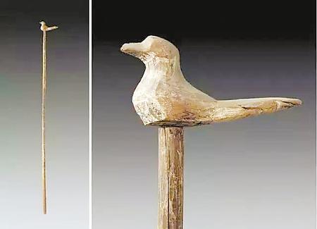 2003年春,江蘇省連云港市博物館在中云鄉(xiāng)華蓋山發(fā)掘一座西漢古墓中,除其他文物外,有一柄杖桿長(zhǎng)2米、頂端雕刻有精美的木斑鳩(鳩高10厘米)的鳩杖令人矚目。