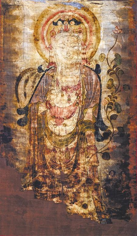 此像雖然褪色嚴(yán)重,殘缺不全,卻是敦煌絹畫(huà)中極為精美的佳作。觀音菩薩面朝前方,腰肢微扭,左肩前傾。面部輪廓清晰雅致,大耳垂肩,雙目微斂,神態(tài)慈悲安詳。右手持柳枝,左手提凈瓶,彎曲的長(zhǎng)莖從瓶口伸出,蓮莖與觀音的站姿相呼應(yīng),搖曳向上在左肩上方開(kāi)出一朵含苞紅蓮。畫(huà)面右下方跪有持蓮花女供養(yǎng)人像二身,她們衣著發(fā)型簡(jiǎn)樸。其邊緣和畫(huà)面下部缺損嚴(yán)重,上部和兩側(cè)保存較完整,左上角長(zhǎng)方形榜題呈空白。整幅畫(huà)面造型柔美繁復(fù)、勾勒緊勁嚴(yán)謹(jǐn),衣帶翻轉(zhuǎn)飄舞,線條行云流水,疏密有致,加之斑斕的色彩,令畫(huà)面熠熠生輝。