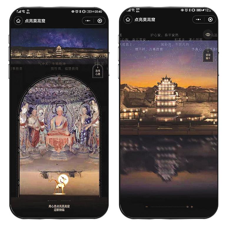 為了感受千年前莫高窟的燃燈民俗,記者迫不及待地體驗(yàn)了一把:進(jìn)入“云游敦煌”官方小程序,通過“點(diǎn)亮莫高窟”入口,即可欣賞星空下的莫高窟全景,并與萬千用戶一起“點(diǎn)亮”崖體上的洞窟。隨著用戶點(diǎn)亮人次增多,畫面中燈光的亮度也隨之增加。至深夜時分,用戶將會看到莫高窟崖體上空“銀河”與洞窟光亮相映成輝的景象,體驗(yàn)千年前莫高窟燃燈盛況。“點(diǎn)亮莫高窟”的創(chuàng)意來自于敦煌文獻(xiàn)中記載的場景,莫高窟燃燈是敦煌歲時民俗。據(jù)記載,每逢特定的時間,當(dāng)?shù)孛癖姇谀呖吲e行盛大的燃燈活動,于窟龕點(diǎn)亮燈盞??偀魯?shù)可高達(dá)700余盞。