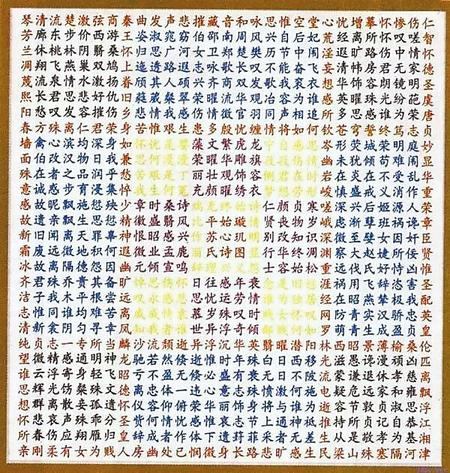 蘇蕙《璇璣圖》不僅是一束厚重的文學(xué)奇葩,也是一幅充滿創(chuàng)意的藝術(shù)巨制。她將詩(shī)歌的載體從傳統(tǒng)簡(jiǎn)帛紙張轉(zhuǎn)換成為錦。錦是有彩色花紋的高級(jí)絲織品。以錦為書(shū)寫(xiě)材料制作《璇璣圖》,除詩(shī)歌本身的創(chuàng)作外,首先需要染絲紡織。錦織好后,又要對(duì)《璇璣圖》謀篇布局,劃區(qū)設(shè)色,書(shū)詩(shī)于錦,然后一針一針地將它繡出來(lái),變?yōu)榛匚腻\字。那每一道工序,要求都極精細(xì),不得有半點(diǎn)疏忽,不然就會(huì)留下污點(diǎn)和遺憾。蘇蕙集眾藝于一身,完美地將其制作出來(lái),體現(xiàn)了她的綜合藝術(shù)才能。取名“璇璣(泛指北斗)圖”,寓意它像北斗,可以旋轉(zhuǎn)地讀。它是在華美的錦上,又以五彩繽紛的絲線繡上《璇璣圖》,不僅顏色更加艷麗,而且那841個(gè)金玉珠璣般文字,展現(xiàn)的令人眼花繚亂的詩(shī)歌園地,更是前不見(jiàn)古人,后不見(jiàn)來(lái)者,比錦繡的光彩更加耀眼奪目。