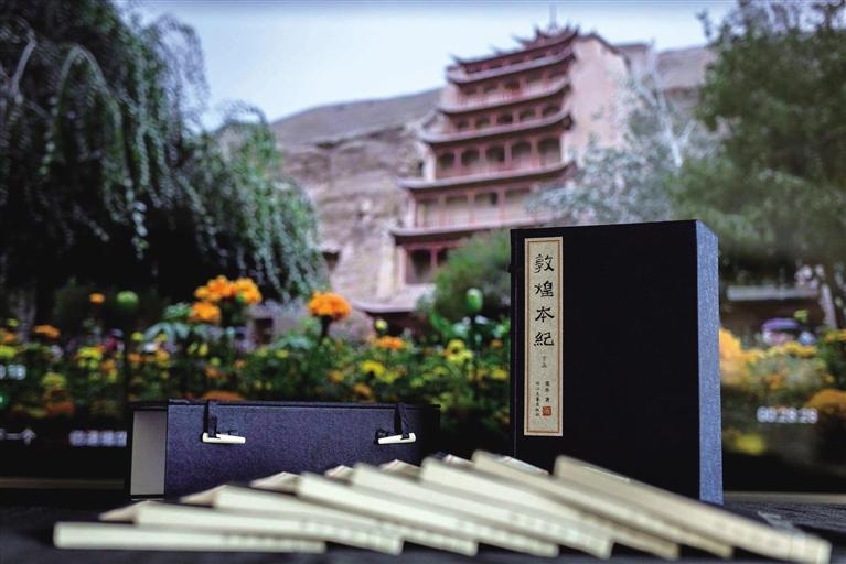 兩個(gè)月后,我如愿以償。《敦煌本紀(jì)》繁體線裝本(限量版)出品,兩函,每函八冊,總計(jì)十六冊,繁體豎排,全手工裝訂。技藝之美,工序之繁,裝幀之考究,未之見過!當(dāng)我打開拿到手上時(shí)肅然起敬,自然會靜下來,恭恭敬敬翻閱,你能感受到甘肅豐富的歷史文化資源、厚重的文化積淀和波瀾壯闊的滄桑巨變。正是偉大的藝術(shù)和同樣偉大的宗教,在敦煌建筑了人類精神的輝煌莫高窟,人們生活在其中,才擁有現(xiàn)實(shí)人生意義的充實(shí)感和踏實(shí)感。