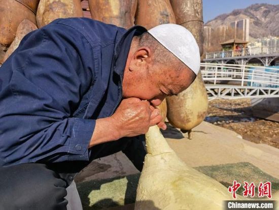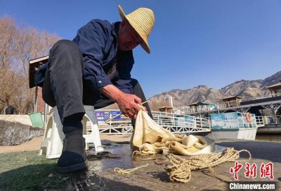 2月24日,春日暖陽下,今年70多歲的省級羊皮筏子非遺傳承人張德寶在蘭州黃河邊制作羊皮筏子,為迎接旅游旺季到來提前做好準備。劉玉桃 攝