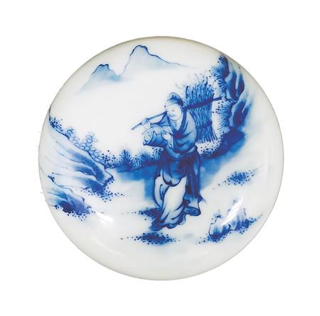 一件是青花印泥盒,制作于20世紀初。直徑7厘米,高3厘米,盒身扁圓,鼓腹,上下相合。盒蓋用青花繪“樵夫讀書”圖。畫面遠處,兩座山峰高聳云間,四周樹木蔥蘢,山石嶙峋。畫面正中的山路上,一樵夫砍柴歸來,身背一大捆柴草,他右手扶著木棍,左手則捧著一本書,雙眼盯著書本,緊抿嘴唇,正津津有味地邊走邊讀。讀到精彩處,露出會心一笑。看來,這個樵夫是極愛讀書的,這種好學精神,難道不值得我們學習嗎?這件瓷印泥盒,青花色澤典雅,人物衣褶神態(tài)描繪細致,栩栩如生,胎體堅致,白釉溫潤,層次清晰,保存完好。