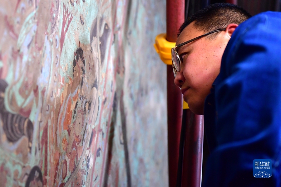 4月19日,在莫高窟第172窟,劉小同在對比臨摹壁畫的細(xì)節(jié)。新華社記者 杜哲宇 攝