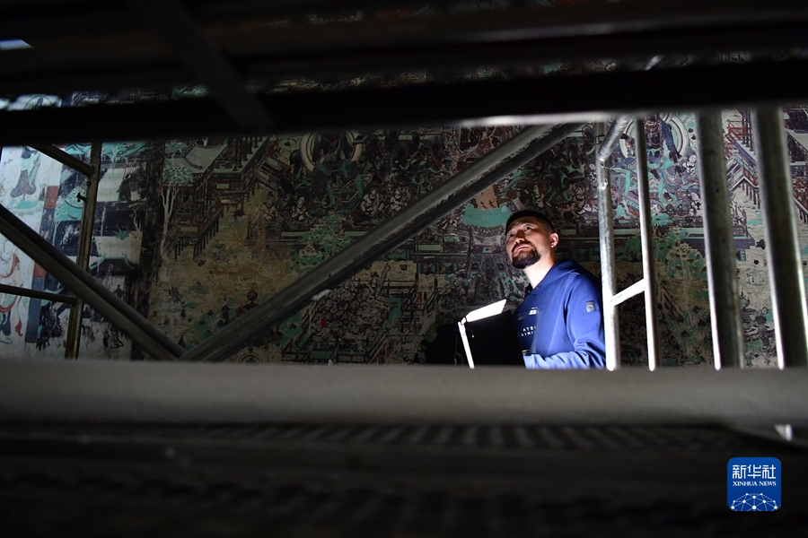 楊金禮今年35歲,他2006年就來到莫高窟,從學(xué)徒做起,逐漸成長為敦煌研究院文物保護(hù)技術(shù)服務(wù)中心的一名壁畫修復(fù)工作者。楊金禮每天都會和同事來到洞窟內(nèi)“面壁修復(fù)”,通過專業(yè)技術(shù)手段解決壁畫產(chǎn)生的起甲、空鼓、酥堿等病害,幫助壁畫對抗時(shí)間的流逝。
