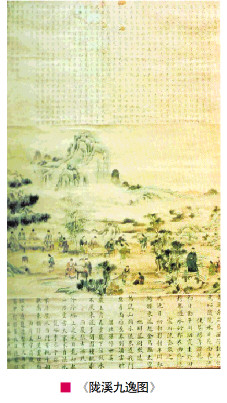 “隴溪九逸”每逢集會,必懸此圖。他們繼承中國文人優(yōu)良的傳統(tǒng)美德,“居廟堂之高則憂其民,處江湖之遠(yuǎn)則憂其君”,看似醉情山水,實則壯心不已,制訂鄉(xiāng)約,設(shè)館授徒,為家鄉(xiāng)的文化教育事業(yè)發(fā)揮著余熱。從這個意義上說,明代秦安“隴溪九逸”正是古代知識分子憂國憂民的一個縮影,亦是那個時代的一抹春色。