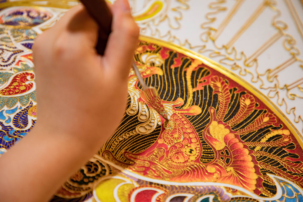 此后30多年,李海明不斷傳承創(chuàng)新,將排絲、壘絲、螺旋絲、柱狀絲等鑲嵌技法引入掐絲琺瑯藝術,利用100多種基礎琺瑯釉料調制出4000多種過渡色及配色,攻克了琺瑯壁畫釉料脫落的難題,提升了琺瑯壁畫作品的藝術價值和收藏價值。截至目前,他共創(chuàng)作2000多幅掐絲琺瑯壁畫作品,先后30多次獲國家級和省級工藝美術類大賽金獎,部分作品被國家博物館收藏。