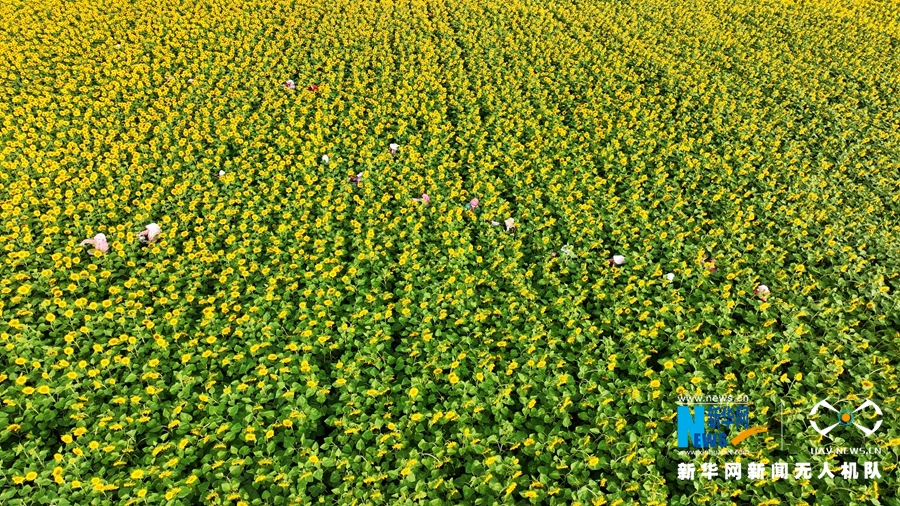 7月23日,甘肅省張掖市臨澤縣新華鎮(zhèn)長(zhǎng)莊村近千畝制種向日葵盛開,金色花海里數(shù)十名葵農(nóng)忙著為向日葵授粉。新華網(wǎng)發(fā)(成林 攝)