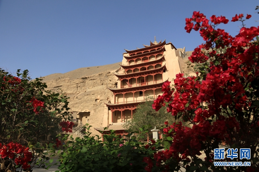 盛夏時節(jié),甘肅省敦煌市莫高窟景區(qū)在三角梅、百日菊等花草的映襯下,顯得分外美麗迷人。