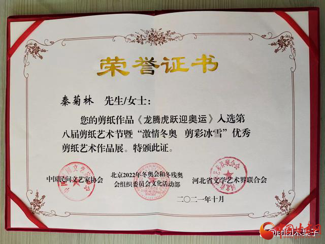 2021年11月由中國(guó)民間文藝家協(xié)會(huì)、河北省文學(xué)藝術(shù)界聯(lián)合會(huì)主辦,河北省民間文藝家協(xié)會(huì)、中共蔚縣人民政府承辦的“第八屆剪紙藝術(shù)節(jié)暨激情冬奧.剪彩冰雪”優(yōu)秀剪紙藝術(shù)大賽中,剪紙作品《龍騰虎躍迎奧運(yùn)》榮獲優(yōu)秀收藏作品同時(shí)被河北省蔚縣博物館永久收藏,并頒發(fā)收藏證書。