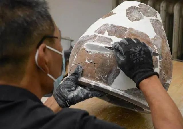 文物工作者對南佐遺址內(nèi)出土的陶器進行修復(fù)(8月25日攝)。新華社記者 李賀 攝
