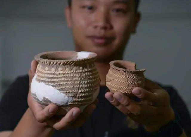考古工作人員在展示遺址內(nèi)出土的箍白泥附加堆紋夾砂陶罐(8月25日攝)。新華社記者 李賀 攝