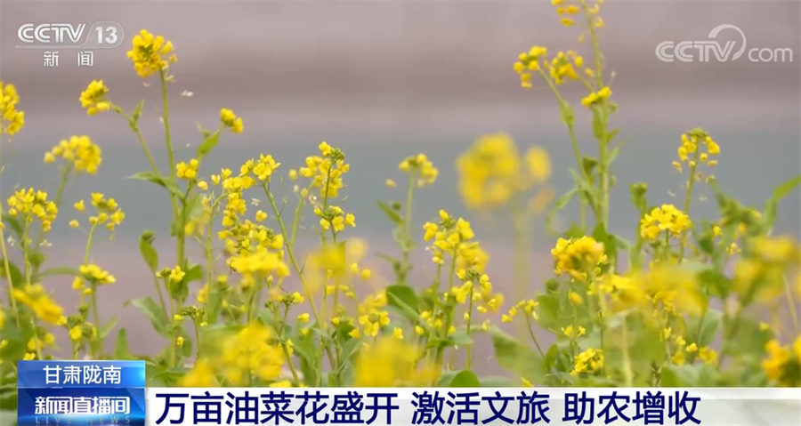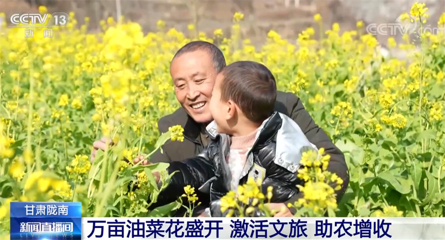總臺記者 項思:這里是甘肅省隴南市文縣,位于甘肅的最南端,也是甘肅最早迎來春天的地方。一江碧水、兩岸青山,大面積盛開的油菜花迎著和煦的春風(fēng)泛起金色的波浪,一股濃烈的春天氣息撲面而來。從春節(jié)前10天左右,這里的萬畝油菜花就陸續(xù)開放了。如今步入春天,油菜花已進入盛花期。文縣接壤四川,嘉陵江的上游白龍江穿越境內(nèi),氣候溫暖潮濕,具有夏無酷暑、冬無嚴(yán)寒的氣候特點,被稱為“隴上江南”。