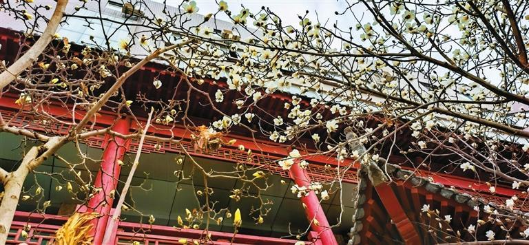 3月10日,記者途經秦州區(qū)自由路玉蘭一條街時欣喜地看到,由東往西走,穿過刻有“秦風在茲”的天水古城牌坊,滿巷漸次盛開的玉蘭花一樹樹玉樹臨風,一朵朵冰清玉潔。平房民居的屋頂上、脊獸斗拱邊,橫橫斜斜“躺臥”著若干膚白肌潤的花朵,借景為鄰靜觀細瞧,人與花似感心意相通,片刻間也能生出不少情趣來。