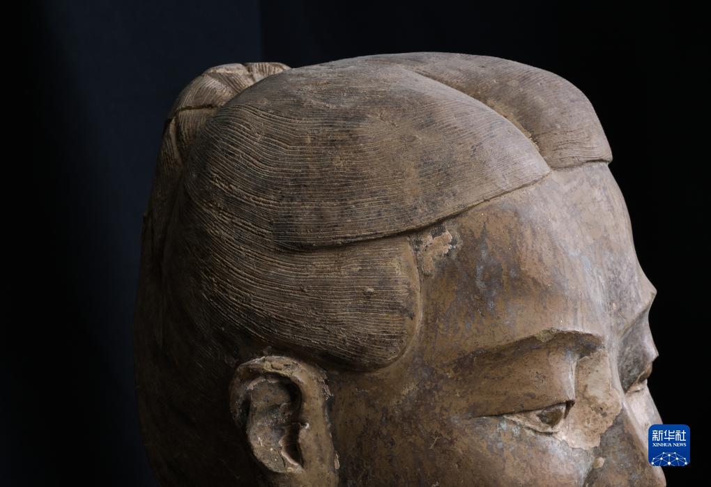 在秦始皇帝陵博物院文物保護(hù)部彩色陶俑修復(fù)室內(nèi),一尊秦俑的頭發(fā)分毫畢現(xiàn)( 8月23日攝)。
