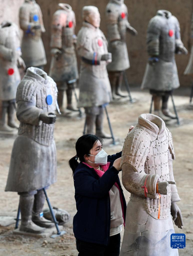 工作人員在秦兵馬俑一號坑遺址進(jìn)行秦俑修復(fù)(4月26日攝)。