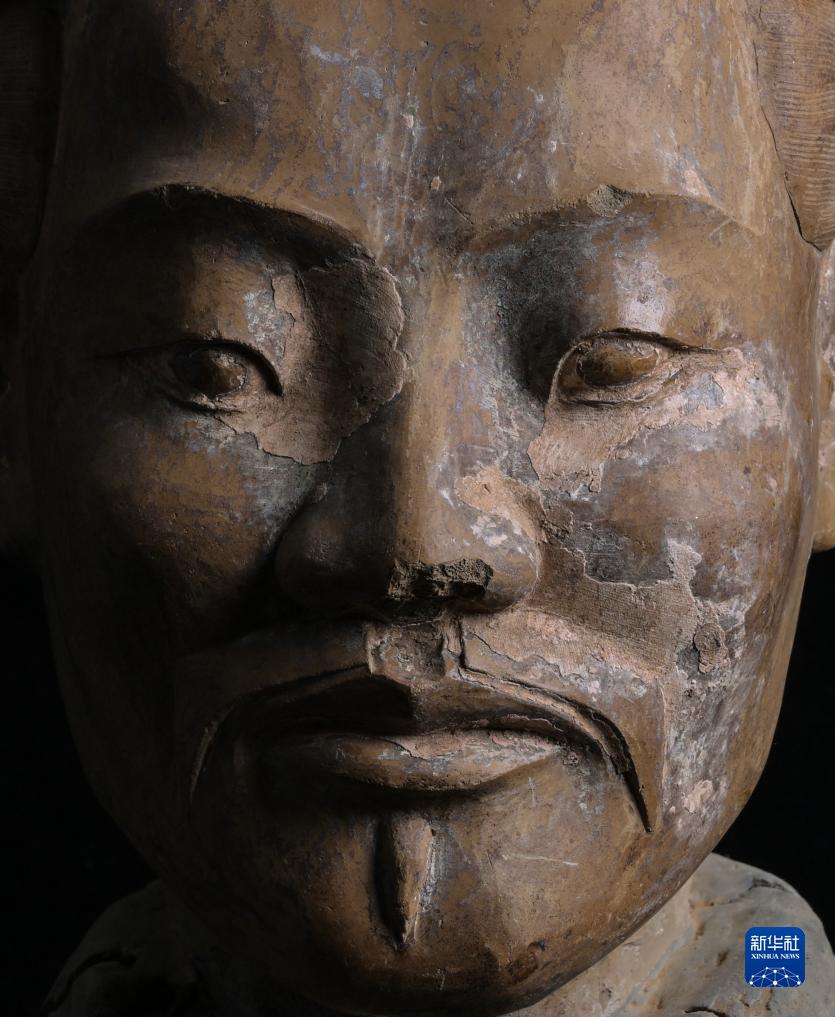 在秦始皇帝陵博物院文物保護(hù)部彩色陶俑修復(fù)室內(nèi),一尊秦俑臉部尚存部分彩繪層。秦俑五官的精準(zhǔn)塑造顯示出秦代匠人具有高超的寫實能力(8月23日攝)。