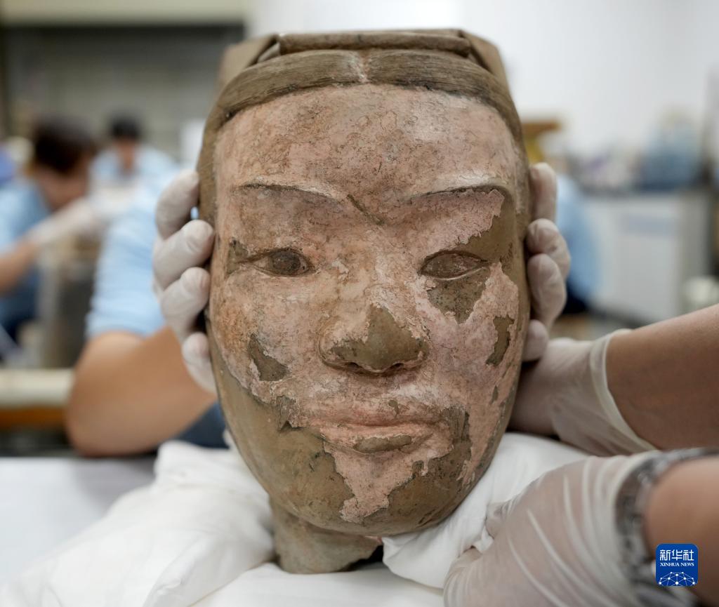 這是秦俑臉部彩繪還原修復(fù)后的樣貌(8月23日攝)。
