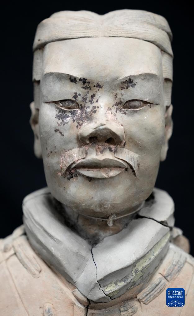 這是秦俑臉部和衣領(lǐng)上的彩繪還原修復(fù)后的樣貌(8月23日攝)。