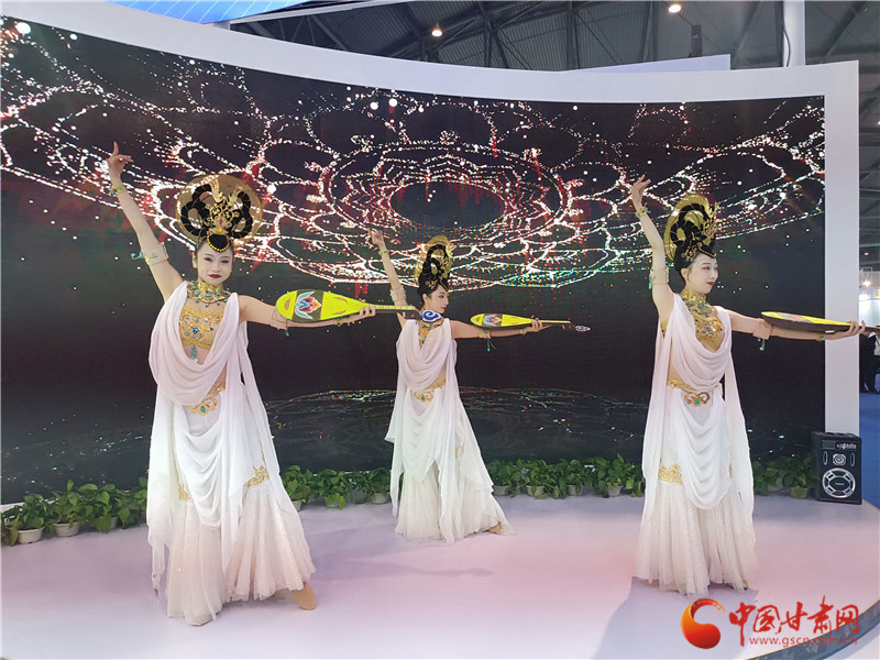 走進甘肅特色版權(quán)館,敦煌文化元素濃郁。無論是展廳頂部的三兔共耳藻井,還是數(shù)字敦煌展區(qū)顯眼現(xiàn)代的四個大字,都在展示甘肅的敦煌元素。而展廳舞臺區(qū)更是以數(shù)字敦煌庫為背景,由舞蹈演員現(xiàn)場表演《妙音反彈》,讓觀眾走進甘肅館,就能發(fā)現(xiàn)敦煌韻。