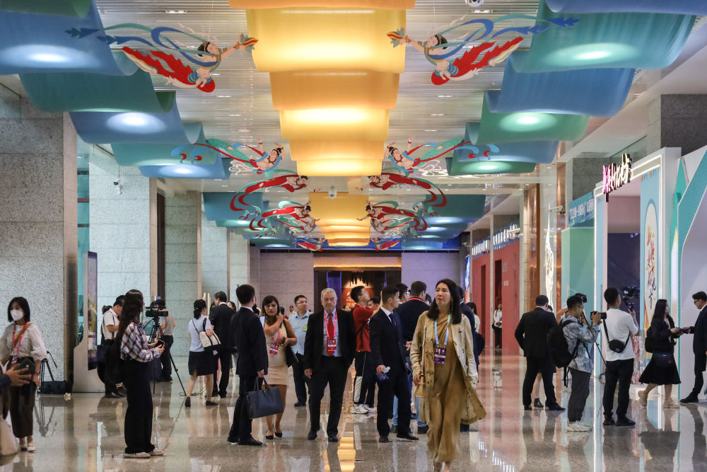 2023年9月6日,與會(huì)嘉賓在第六屆絲綢之路(敦煌)國際文化博覽會(huì)上參觀。新華社記者 馬希平 攝
