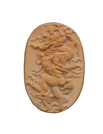 1990年出土于莊浪縣水洛鎮(zhèn)寺坪塬遺址。高11.7厘米,寬7.9厘米,厚1.5厘米,呈橢圓形。泥質(zhì)紅陶,背面平素。畫面表現(xiàn)的是某神話故事,正面飾淺浮雕紋飾,正中為一巨龍張牙舞爪、怒目圓睜、奮力騰空,一女神左手緊抓龍角,右手持劍欲砍龍首;龍頸部有一女神拿繩索套縛,另一女神在龍胸部作拔劍狀;一力士則用力拽龍尾,凸目張嘴,聲色驚恐萬分;在龍的后肢旁還有一女神右手握劍砍殺。五神皆神態(tài)各異,造型逼真,生動表現(xiàn)了五神伏龍時驚心動魄的場景。