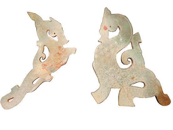 這對戰(zhàn)國谷紋玉龍,一個完整,一個略有殘缺。春秋戰(zhàn)國的龍,龍身很長,蜿蜒曲折,一般成對出現(xiàn)。龍身的裝飾,以谷紋或勾云紋為主,造型較多見的有蟠龍、行龍、虬龍、夔龍。戰(zhàn)國的龍身形態(tài)各異,基本上有個共同特點—“水滴眼”,龍頭多為“連云頭”,廓線出鋒,棱角分明。裝飾上多為陰刻和浮雕工藝。