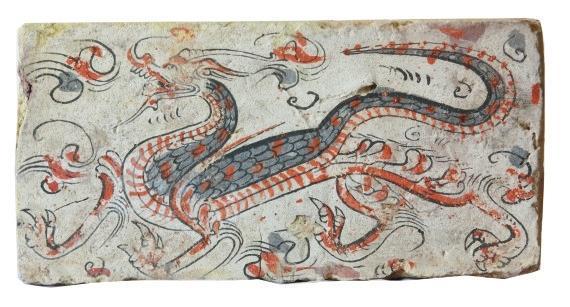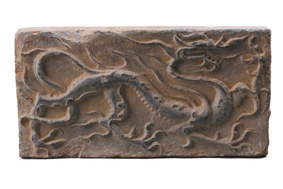 磚面上龍的形象棱角分明,骨架清瘦。龍身前屈后伸,起伏轉(zhuǎn)折,龍首高昂,張口吟嘯。前肢呈登騰狀,后肢做行進狀。鬣鬃飛揚,揚爪攪尾,四爪如鷙,整條龍動態(tài)十足,形象逼真,為五代時期模印花磚中的精品。