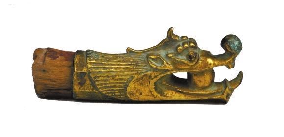 肅南裕固族自治縣馬蹄鄉(xiāng)二夾皮村出土。長19.3厘米,銅質(zhì),鎏金。形狀為龍頭,頸部中空,龍頭部分為獨角,龍眼暴睜,上唇卷起,口內(nèi)含有一圓球。頸部龍發(fā)呈條形狀。