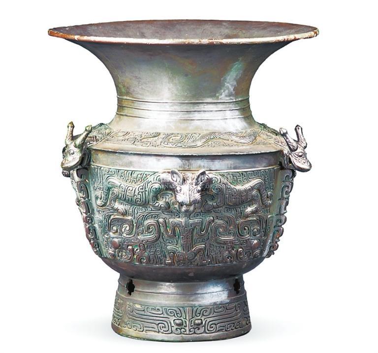中國(guó)國(guó)家博物館收藏的龍虎紋青銅尊,高50.5厘米,重26.2千克,為一件體形較高大的盛酒器。青銅尊肩部以圓雕和浮雕相結(jié)合,塑造3條生動(dòng)的蟠龍形象,龍身蜿蜒,龍首探出,額有雙角,闊吻巨口,兩眼大睜。腹部紋飾為一個(gè)虎頭兩個(gè)虎身,虎口之下有一人形,人頭銜于虎口之中。虎身下方以扉棱為界,飾兩夔龍相對(duì)組成的獸面。從主體花紋看,龍、虎、人造型莊嚴(yán)穩(wěn)重、奇特神秘,特別是龍頭和虎頭用澆鑄法從外壁突兀凸起,雄健粗獷,比起用高浮雕法更具有一種威武逼人的悍氣。龍虎尊圓形大口表示上天,肩部神龍游蕩于空中;猛虎張牙舞爪守護(hù)大地。龍虎尊的鑄造采用十八塊母范經(jīng)兩次焊接而成,渾然一體,毫無痕跡。整器工藝精湛,花紋線條洗練,是商代青銅器中的精品。