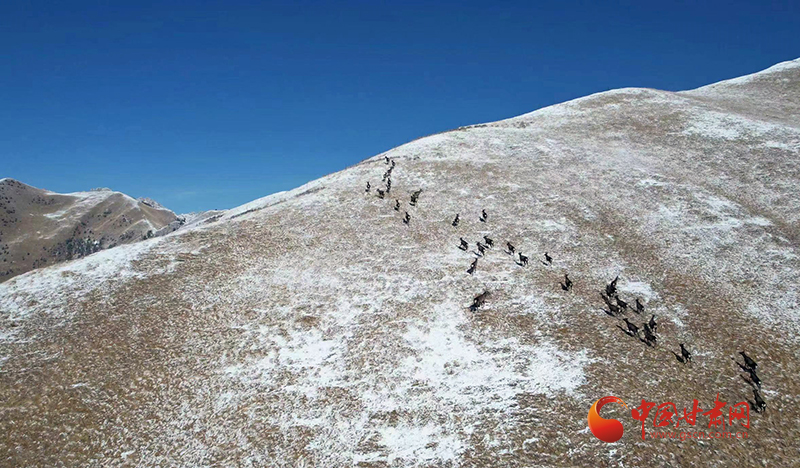 春日的祁連山仍有積雪覆蓋,大種群馬鹿沿著山坡覓食前行,時而漫步,時而奔跑,場面非常壯觀,成為保護(hù)區(qū)一道靚麗風(fēng)景,也給寂靜的山嶺增添了生機(jī)與活力。
