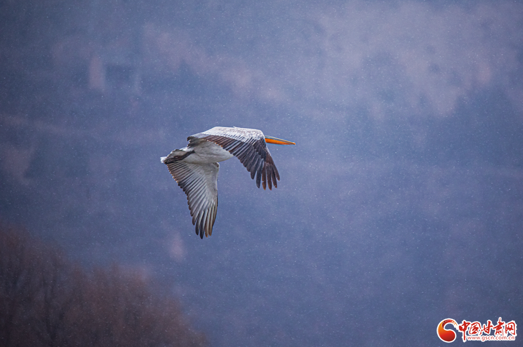 當(dāng)天,天空下著大雪,天氣寒冷,一位野生鳥類攝影愛好者驚喜地在崇信縣汭河段發(fā)現(xiàn)了一只卷羽鵜鶘盤旋于河道上空,經(jīng)過(guò)跟蹤其降落于發(fā)現(xiàn)地20里外的銅城水庫(kù)附近水域,與蒼鷺混群。