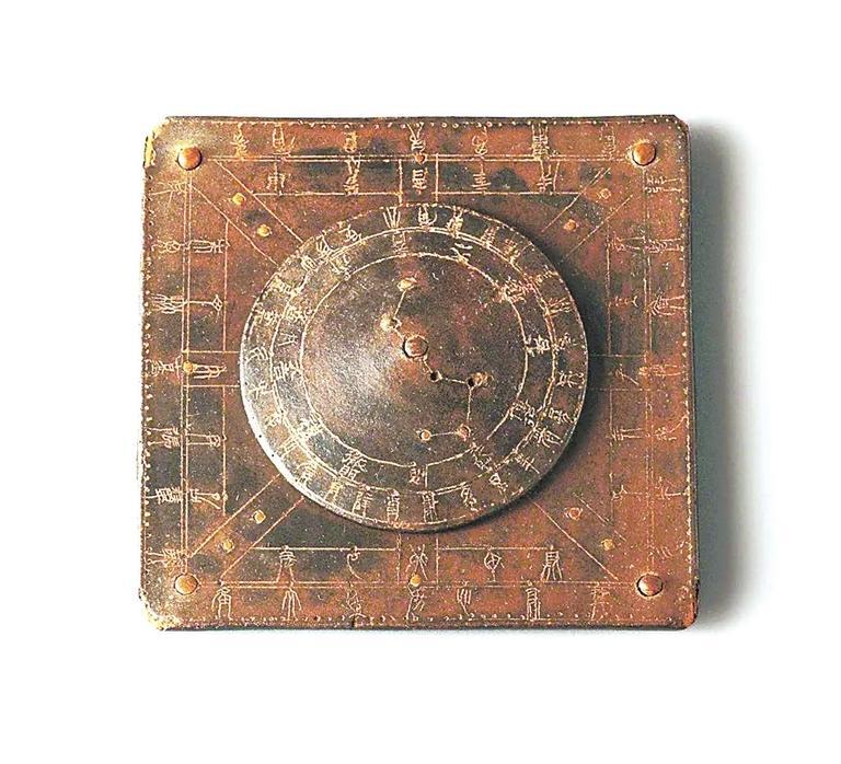 1972年武威市磨嘴子漢墓出土的這件漆栻盤,直徑6厘米,厚1厘米,地盤邊長9厘米,木胎,髹深褐色漆。由圓形的天盤和方形的地盤構制而成,天盤位于地盤之上,正中心以竹軸貫聯(lián),使天盤可以轉動。天盤中陰刻兩個同心圓,將其分為三區(qū):內區(qū)以竹珠鑲嵌北斗七星,星間刻線相連,斗柄中節(jié)穿過圓心。中區(qū)內隸書陰刻十二月神,外區(qū)陰刻篆書二十八宿名。地盤以兩個相套的正方形分為三區(qū):內區(qū)納天盤,中區(qū)陰刻篆書十天干中的八干(不刻戊己)和十二地支名,外區(qū)陰刻篆書二十八宿名。