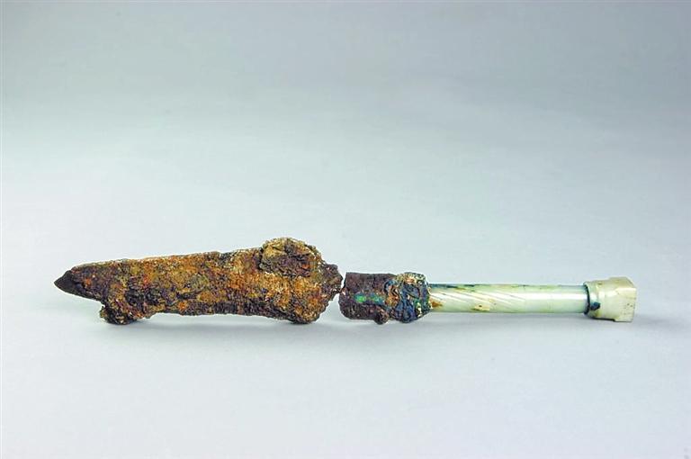 玉柄鐵劍出土于河南三門峽虢國國君虢季的墓葬,全長34.2厘米,其中劍柄長12.2厘米,劍身長22厘米。劍柄為銅芯,起到連接劍柄和劍身的作用,銅芯外鑲有晶瑩透亮的和田美玉和綠松石,并有精美的竹節(jié)飾紋,劍身和劍柄的結合處也鑲有綠松石。劍身經由北京科技大學冶金與材料史研究所鑒定,是由塊煉法鍛制而成,劍身外有絲織品包裹的痕跡,應當是被絲織品包裹后放入劍鞘。劍鞘則由牛皮精制而成。這把玉柄鐵劍不僅制作精美,而且其利用玉、銅、鐵三種材料制作而成,是我國目前考古發(fā)掘出土的年代最早的人工冶鐵制品。它將我國的人工冶鐵歷史推前了近兩個世紀,被專家們譽為“中華第一劍”。