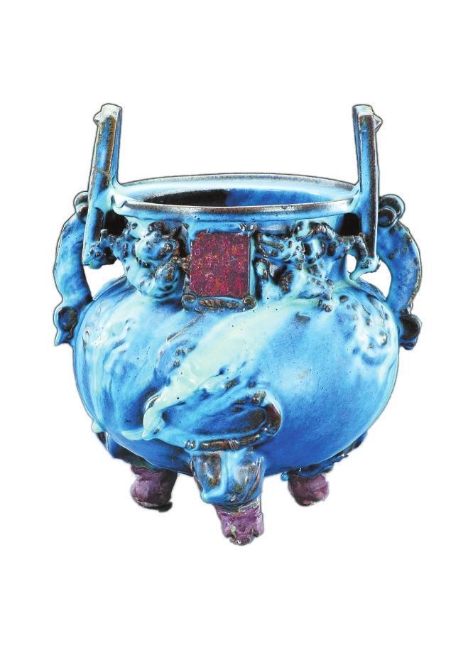 香爐整體造型為雙立耳,圓鼓腹,三獸足,體形較大。頸部雕貼三只麒麟,正面有一初方形題記,刻有“己酉年九月十五小宋自造香爐一個”共計15字,經考證:“己酉年”是公元1309年,屬于元代中期。香爐通體施天青色釉,釉層較厚,在高溫中由于積釉濃淡不一,縱橫流淌到器表各處,形成天青、天藍、灰藍等不同釉面,再與紅褐色的露胎對比,有了銅器般的金屬質感。