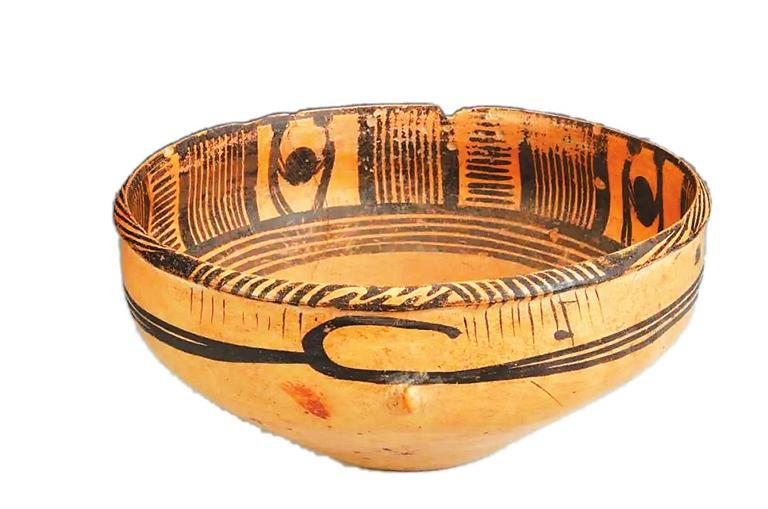 這件距今5000多年的古代彩陶作品,制作精致,圖案精美,人物形體鮮明,造型和動作既抽象又生動。彩陶盆通高11.3厘米,口徑24.5厘米,底徑9.8厘米,細泥制作,唇外侈,略鼓腹,腹部兩側有對稱的小鈕??谘貎缺跒樗慕M雙人抬物圖案,中間以橫豎線條組成的幾何圖案間隔,形成一周四方連續(xù)的紋飾帶,繪制于陶盆內側上部,二人的頭部以圓點代表,軀干和四肢以線條描繪。兩人相向站立,共同抬起一個碩大的圓形物體,畫面簡潔而生動,寥寥數(shù)筆就將人抬重物時雙腿開立、腰背微屈用力的形態(tài)刻畫得惟妙惟肖。陶盆上精妙的紋飾讓它成為我國最早在彩陶上表現(xiàn)原始先民勞作場景的藝術珍品。