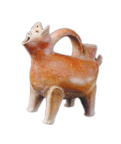 紅陶獸形壺,高21.6厘米,夾砂紅陶,通體磨光,遍施紅色陶衣,光潤亮澤。器型圓面聳耳,拱鼻,張口,耳穿小孔,四肢粗壯,短尾上翹,背裝弧形提手,尾根部一筒形注水口,嘴可往外倒水,腹部鼓起加大了容積,四足立起可供加熱,使用方便,造型生動美觀,集實用與仿生藝術于一身,是大汶口文化獨有的器形,充滿了創(chuàng)造性的靈感,是新石器時代一件難得的陶器珍品。