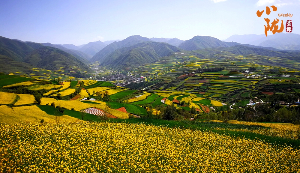 遠(yuǎn)處黃綠交錯(cuò)的油菜花,在藍(lán)天白云襯托下艷麗多彩,起伏的山巒上黃色顯得尤為斑斕,這里是眾多畫家、藝術(shù)家的創(chuàng)作天堂。