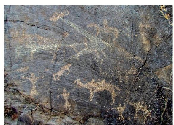 黑山巖畫全稱為“黑山摩崖淺石刻巖畫”,分布于嘉峪關(guān)西北約 10—20公里處的黑山峽谷陡崖峭壁上,為遠(yuǎn)古時期黑山地區(qū)游牧民族生產(chǎn)、生活的真實記錄?,F(xiàn)共發(fā)現(xiàn)分布在黑山石關(guān)峽口、磨子溝、蕉蒿溝、四道股形溝、紅柳溝、交河溝六處戰(zhàn)國至明代時期的巖畫,共 157 幅。黑山巖畫反映的時限跨度大,時空關(guān)系復(fù)雜,涉及部族較多。畫面所反映的內(nèi)容豐富多彩,有動物、人物、佛塔、植物等,還有大型的操練舞蹈場景。涉及人類學(xué)、社會學(xué)、歷史學(xué)、考古學(xué)、美術(shù)學(xué)、生物學(xué)、地理學(xué)等多個學(xué)科,具有較高的研究價值。