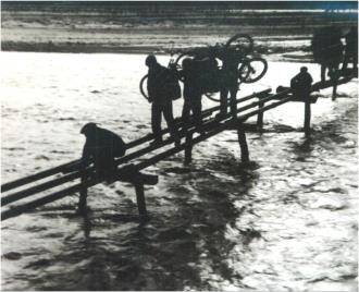 左圖為改造后的備戰(zhàn)橋,右圖為昔日涇河沿岸群眾搭建簡(jiǎn)易木橋過(guò)河的畫面?! 。ㄡ轻紖^(qū)檔案館供圖)
