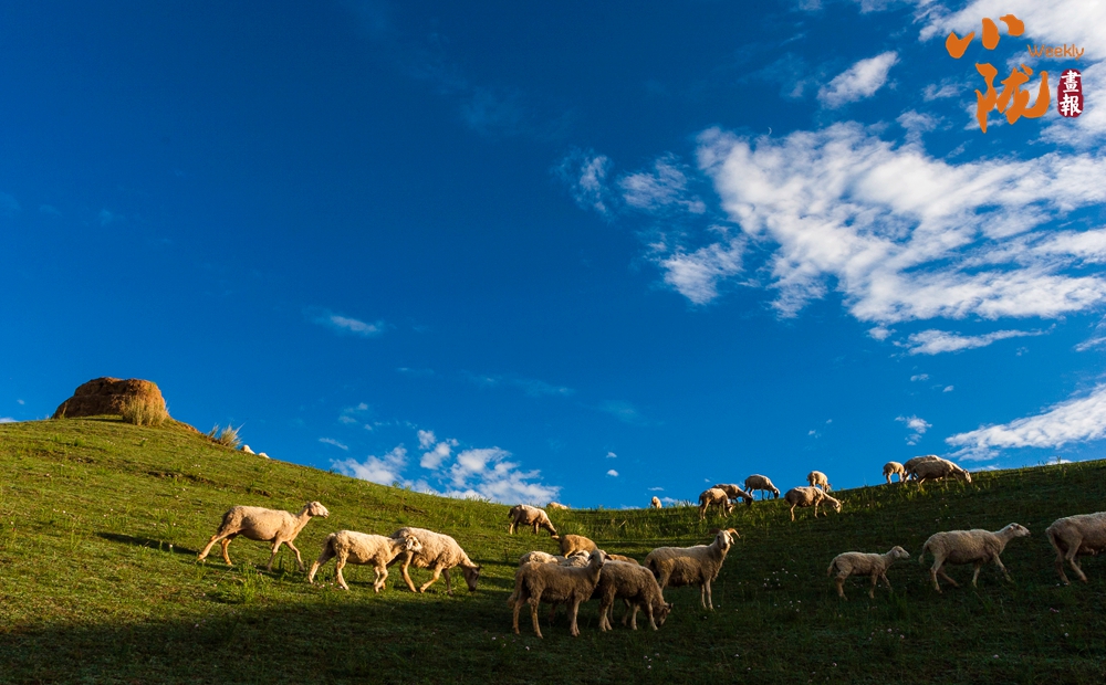 遠(yuǎn)處白云悠悠,百萬畝草原一望無垠,羊群點(diǎn)綴的大草原和那殘存的烽火臺(tái)相映成趣,呈現(xiàn)出一幅綠意盎然的詩意畫卷。