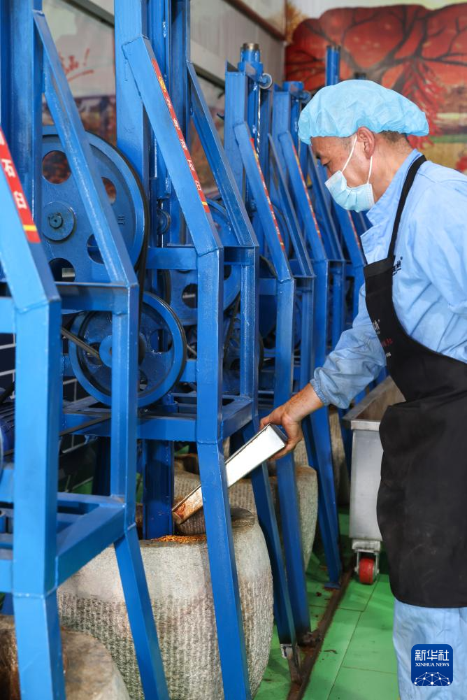 7月22日,工作人員在甘肅天水市甘谷縣安遠鎮(zhèn)的辣椒烘干和加工車間里操作電動石臼。新華社記者 呂帥 攝