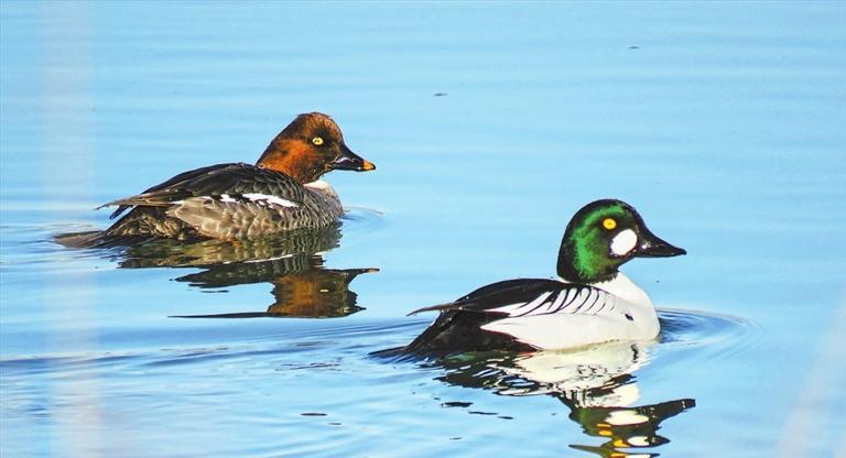 鵲鴨同樣喜好潛水,但主要在追蹤小魚(yú)和水生昆蟲(chóng)。雖然只是中等體型,它卻有個(gè)大大的腦袋,仿佛戴了一頂帽子。在雄鴨墨綠色的頭上,明黃色的眼睛前下方生出個(gè)白色圓斑,頗顯呆萌。體羽則黑白相間,故得“鵲”名。