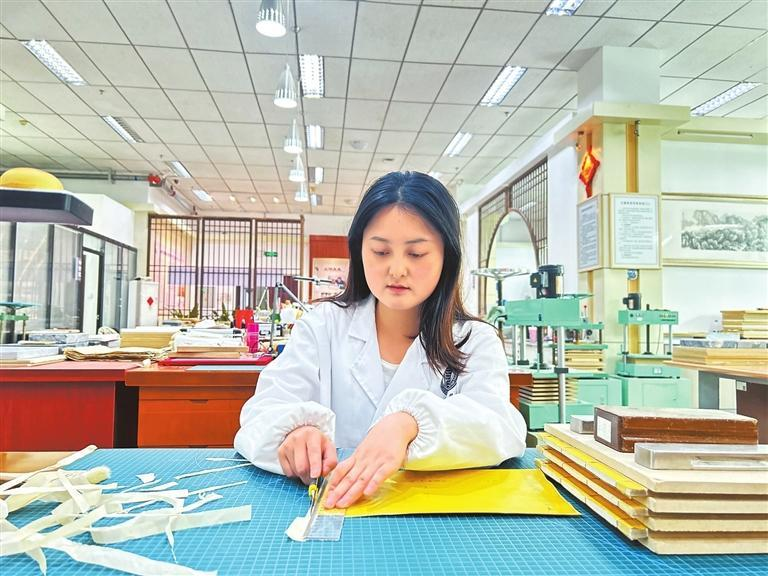 今年23歲的羅雪瑞是保護(hù)中心里的古籍修復(fù)師。她告訴記者:“在學(xué)校時學(xué)的是工藝美術(shù)品設(shè)計專業(yè)書畫裝裱方向,需要很強(qiáng)的動手能力,這為古籍修復(fù)工作打下了很好的基礎(chǔ)。”
