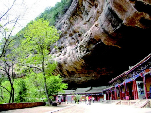 那天,自然之神行走于隴山渭水間,他雙手揮動(dòng),如雕如塑,將山川大地刻畫得瑰麗而神奇。當(dāng)他完成麥積山的杰作后,輕輕一拂指尖,卻不小心將一座砂崖的底部抹去,使之形成一面巨大的石檐。這石檐下,形狀恰似蛤蟆之嘴,能藏千軍萬(wàn)馬,充滿了神秘與威嚴(yán)。